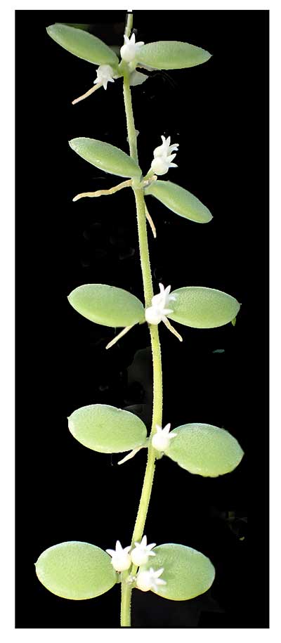 Growth form: Slender creeping epiphyte often forming dense masses on trees on which it occurs. Foliage: Leaves opposite, round, dull greenish-yellow, often thick and succulent, 7 mm – 10 mm in diameter. Young leaves occasionally with powdery bloom. Flowers: Flowers white to yellowish-white, about 1 mm in length, occurring in umbels of 1 – 5 flowers. Fruit: Hairless, pale green or yellow follicles occur singly or in pairs, hanging down from the stem (2 – 4 cm × 0.4 cm). They split open on one side when mature, releasing oblong seeds (1.5 – 2.5 × 0.4 – 0.7 mm). (Flora & Fauna Web)