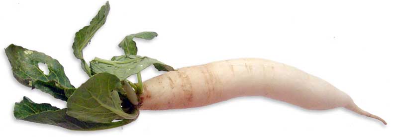 • Erect annual herb up to 1 m tall. Roots: Roots vary widely in terms of shape and size. In Southeast Asia, the Chinese Radish cultivar group is most common. The upper part of the taproot and the hypocotyl (the portion of the stem below the cotyledons) becomes swollen and forms a white, cylindrical tuber. It has a mild flavor and a crisp texture. Southeast Asian cultivars within the Chinese Radish cultivar group tend to be smaller than those found in China and Japan (10-25 cm long, 4-5 cm wide). Foliage: Leaves are either glabrous or have a few stiff hairs. The lower leaves are larger than the upper ones and arranged in a rosette instead of alternate leaf arrangement. Lower leaves are oblong (elongated), oblong-ovate (elongated to egg-shaped) to lyrate-pinnatifid (leaf blade divided into lobes that create a feather-like pattern with the largest lobe at the tip). Flowers: White to light purple, fragrant flowers (1.5 cm wide) are arranged in a raceme (a spike-like inflorescence composed of flowers mounted on stalks up to 2.5 cm long). The raceme occurs near the stem tip. (64)