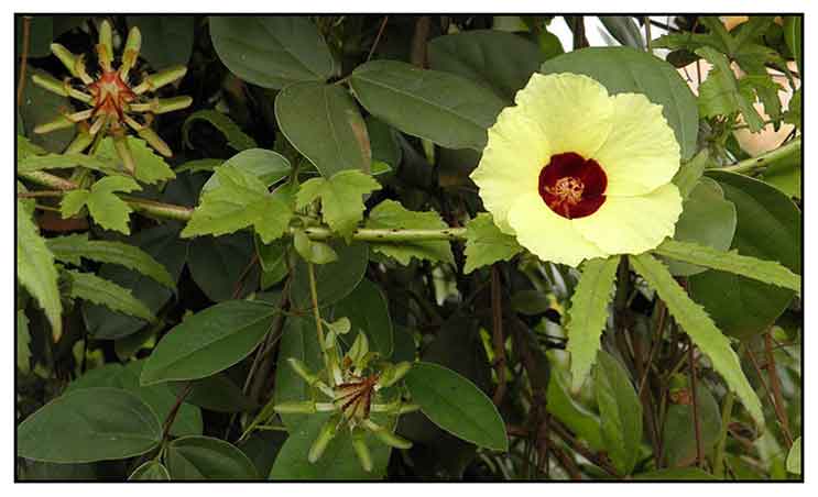 • Bush Sorrel is a weak-stemmed, prostrate or climbing plant covered with soft hairs and scattered prickles. The leaves are rounded, up to 10 X 10 cm, and deeply and palmately 3- to 5-lobed, the lobes being toothed. The flowers are yellow, with a dark center, and occur singly in leaf axils. Petals are obovate, up to 6 cm long and 4 cm wide. This flower can be easily identified by its unique false sepals, which are 8-10 in number. The false sepals (actually bracts) are forked into a spoon-shaped outer part, and a narrow linear inner part. But for this feature, the plant can be confused with Deccan Hemp. The capsules are hairy and ovoid. The seeds are downy. (Flowers of India)
