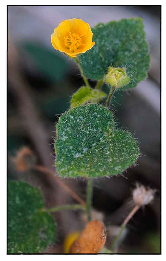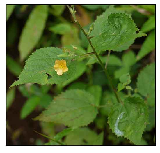 Sida mysorensis is a subshrub-like herb, erect, to 1 m tall. Stem with minute stellate hairs, multicellular glandular hairs, and long simple hairs. Stipule filiform, ca. 5 mm; petiole 1-3 cm, pilose; leaf blade ovate-cordate, 3-6 × 2.5-4.5 cm, viscid-stellate on both surfaces with minute stellate hairs and multicellular glandular hairs, base cordate, margin crenate, apex acuminate. Flowers solitary or paired, axillary or subterminal, often on congested reduced axillary shoots. Pedicel slender, 2-6(-15) mm, articulate at or above middle. Calyx widely campanulate, 6-8 mm, sparsely pilose with long hairs, lobes 2.5-3 × ca. 2.5 mm, acute or acuminate. Corolla yellow, 1-1.2 cm in diam.; petals obtriangular, glabrous. Filament tube strigose. Schizocarp nearly globose, 3-4 mm in diam.; mericarps 5, ovoid-tetrahedral, ca. 2.5 mm, smooth, apex shortly hairy, not awned, shortly acute, enclosed in persistent calyx. Seeds ovoid, slightly 3-sided, ca. 2 mm, glabrous. (Flora of China)