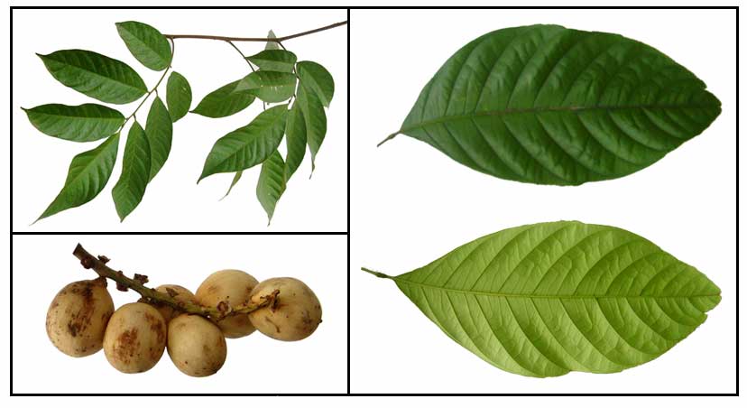 • The tree is average sized, reaching 30 meters (98 ft) in height and 75 centimeters (30 in) in diameter. 30 years old trees grown from seed and planted at 8 × 8 meter spacing can have a height of 10 meters and diameter of 25 cm. The trunk grows in an irregular manner, with buttress roots showing above ground. The tree's bark is a grayish color, with light and dark spots. Its resin is thick and milk colored. Pinnately compound leaves are odd numbered, with thin hair, and 6 to 9 buds at intervals. Buds are long and elliptical, approximately 9 to 21 centimeters (3.5 to 8.3 in) by 5 to 10 centimeters (2.0 to 3.9 in) in size. Upper edge shines, and the leaves themselves have pointed bases and tips. Stems of the buds measure 5 to 12 millimeters (0.20 to 0.47 in). Flowers are located in inflorescences that grow and hang from large branches or the trunk; the bunches may number up to 5 in one place. They are often branched at their base, measure 10 to 30 centimeters (3.9 to 11.8 in) in size, and have short fur. Flowers are small, with short stems, and are perfect. Sheathe is shaped like a five lobed cup and is colored a greenish-yellow. Corona is egg-shaped and hard, measuring 2 to 3 millimeters (0.079 to 0.118 in) by 4 to 5 millimeters (0.16 to 0.20 in). There is one stamen, measuring 2 millimeters (0.079 in) in length. Top of the stamen is round. Pistil is short and thick. Fruit can be elliptical, ovoid or round, measuring 2 to 7 centimeters (0.79 to 2.76 in) by 1.5 to 5 centimeters (0.59 to 1.97 in) in size. Fruits look much like small potatoes and are borne in clusters similar to grapes. Larger fruits are on the variety known as duku. It is covered by thin, yellow hair giving a slightly fuzzy aspect. Skin thickness varies with the varieties, from 2 millimeters (0.079 in) to approximately 6 millimeters (0.24 in). With the skin removed, the fruit resembles peeled garlic in appearance, with around five white, translucent lobes, some of which contain a flat, bitter tasting seed. Seeds are covered with a thick, clear-white aril that tastes sweet and sour. (29)