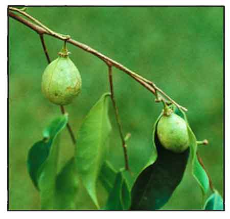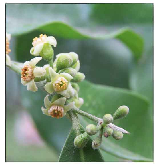 • Tree, up to 20(-40) m tall, with bole up to 60 cm in diameter, usually straight, sometimes fluted or with thick (10 cm) buttresses up to 2 m high; bark smooth, whitish; branchlets slender, pale brown, pubescent, glabrescent. Leaves simple, alternate; petiole 4-6 mm long; blade elliptical-oblong to oblong-lanceolate, 7.5-12 cm × 2.5-5.5 cm, chartaceous to subcoriaceous, glabrous, sometimes pubescent and glabrescent beneath, shiny on both surfaces, base acute, attenuate or obtuse, apex acuminate, acumen up to 2 cm long; veins in 12-16 pairs, rather irregular, often branched, elevated and distinct beneath, curving upward to the margin, plane or obscure above. Inflorescence a terminal, axillary or supra-axillary, sometimes internodal umbel, usually branched into 2-3 umbels, each with about 10 flowers; peduncle 5-15 mm long; pedicel slender, 3-6 mm long. Flowers 5-merous, campanulate, 5-6 mm long, green or dirty-yellow, scattered puberulous outside; floral tube nearly glabrous inside, distinctly 10-ribbed, persistent in fruit; calyx lobes 5, ovate-oblong, 2-3 mm long, almost as long as the tube, reflexed, densely puberulous within; petaloid appendages 10, inserted at the throat of the tube, oblong or slightly ovate-oblong, about 1 mm long, slightly incurved, densely pilose; stamens 10, free, emerging from the throat of the tube, filamentous, 1.2-2 mm long, episepalous ones longer than the others; anthers linear, obtuse; pistil included; ovary ovoid, 1-1.5 mm long, 2-celled, densely pubescent; style obscure, stigma capitate. Fruit a loculicidal capsule, obovoid or obovoid-cylindrical, 3-4 cm × 2.5 cm, usually compressed, pubescent, glabrescent, base cuneate, apex rounded; pericarp woody. Seed ovoid, 10 mm × 6 mm including a beak 4 mm long, densely red-haired, bearing from the base a twisted, tail-like, pubescent appendage as long as the seed. Seedling with epigeal germination. (2)