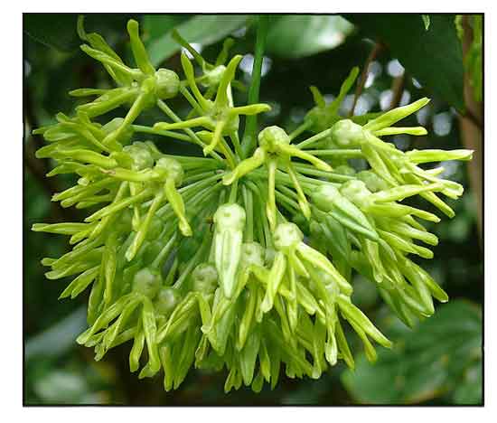 • Latok is a woody vine with slender, smooth or slightly hairy branchlets. Leaves are thin, ovate to oblong-ovate, 8 to 13 centimeters long, 3 to 8 centimeters wide, pointed at the tip and slightly heart-shaped at the base. Cymes are axillary and umbelliform. Flowers are numerous, greenish-yellow, odorless, about 1.5 centimeters long, and hairy at the throat. Fruit is lanceolate, about 15 centimeters long. Seeds are flattened and crowned with silky hairs.