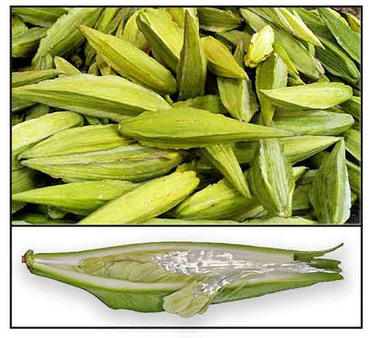 Pericarp is cooked and eaten as vegetable, with the consistency and taste of string beans.