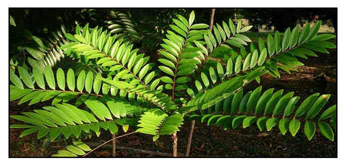 • An usually unbranched, small tree up to 12 m tall, with branches crowned by a rosette of leaves. Foliage: Alternate, stalked pinnate leaves are up to 100 cm long. Its leathery leaflets are lance- to egg-shaped, dark green above, mid-green below, and 5–20 by 1–6 cm. Flowers: Glowers are bell-shaped, greenish white to greenish red or purple, 6 mm wide, with petals that are 4.5–5.5 by 1.5–3 mm, and develop each into 1–5 fruits. Fruits: Fruits are oblong, yellow when ripe turning red, and 10–20 by 5–12 mm. (30)