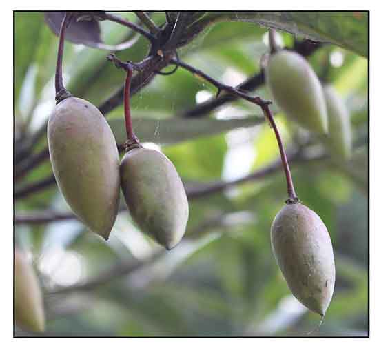 Mala is a rather large and smooth tree growing to a height of 24 meters. Leaves are elliptic-lanceolate, 9 to 14 centimeters long, 2.5 to 4 centimeters wide, pointed at both ends. Flowers are white, about 2 centimeters long, growing on short sprays at the top of branchlets. Sepals are lanceolate, 15 millimeters long, 3 to 4 millimeters wide. Petals are white, oblong-obovate, about 2 centimeters long, and deeply fringed at the tip. Fruit is a drupe, pale green, ellipsoid, with a thin layer of flesh.