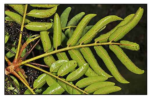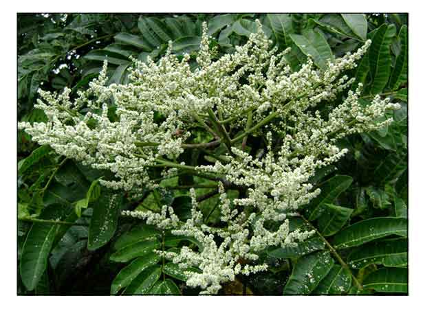 Rhus taiteneis is a large tree up to 30 m or more in height, with puberulent young stems and with the trunk base typically extending into low buttresses; bark mottled brown, rough, inner bark red-brown to pink oozing white sap, wood cream-colored. Leaves odd- (sometimes even-) pinnately compound, alternate, rachis mostly 15-50 cm long, pubescent, leaflets 7-19, opposite or sometimes alternate, blades mostly elliptic, 4-20 cm long, reddish when young, oblique at the base, rounded or broadly acute to acuminate at the tip; surfaces pubescent to subglabrous,l upper side darker with red to yellow veins, veins of lower side often pubescent; margins entire; petiolule 1-5 mm long. Inflorescence a terminal or upper-axillary, widely branching, many-flowered panicle 8-30 cm long, with a densely pubescent axis; flowers unisexual, trees dioecious. Calyx deeply divided into 5 subround lobes 0.5-1 mm long, subsessile. Corolla rotate, with 5 white to pink, orbicular petals 1.5-2 mm long. Ovary of female flower superior; styles 3, each with a short terminal stigma; ovary vestigial in the male flower. Stamens of male flowers 5, free, absent in the female flowers. Fruit a shiny black, compressed-ellipsoid drupe 3-5 mm in diameter. Flowering typically from March to September (but sometimes beyond this, e.g., December), fruiting during most months (and perhaps persisting on the inflorescence), but not at the same time as flowering, with a peak from April to October (Trail n.d.). Distinguished by its large tree habit; milky sap; alternate, odd-pinnately compound leaves that are reddish when young; large dense panicles of tiny white to pink, 5-parted flowers; and small, shiny black drupes. (Rainforest Trees of Samoa) (8)