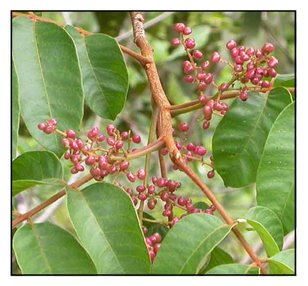 Rhus taitensis is a tree growing up to 30 m. Bole is cylindrical, sometimes with buttresses, up to 70 cm diameter. Exudate emerging from layers in the blaze. Lenticels often large and conspicuous, more than 1 cm diameter. Leaflet blades about 4-15 x 1.5-5 cm. Leaflets and twigs produce a milky exudate. Pulvinus usually apparent on the terminal leaflet. Inflorescence quite large and complex. Calyx lobes broadly ovate, about 0.8-1 mm long. Petals narrowly ovate, elliptic or obovate, glabrous outside, pilose inside for the lower half, about 2-2.5 mm long. Disk 10-lobed. Stamens inserted outside the disk, filaments about 1-1.2 mm long , anthers about 0.8-1 mm long. Fruits produced in great abundance. Fruits ovoid, but laterally compressed, about 6-8 x 4-8 mm. Seeds enclosed in a hard endocarp. Seeds flattened, about 2-3 mm diam. Cotyledones 3-veined. (2)