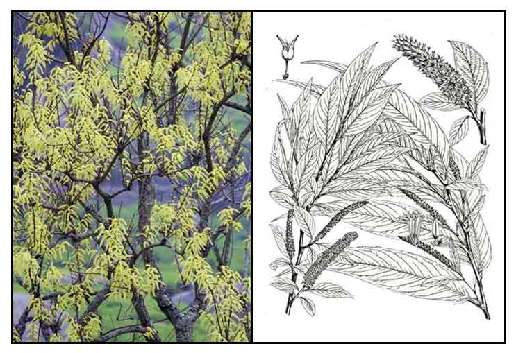• Malatiki is a small deciduous tree, flowering after leafing. Bark is rough, with deep, vertical fissures. Young shoots and young leaves are silky. Leaves are lanceolate, 8 to 15 centimeters long, with minutely and regularly toothed margins. Male sweet-scented catkins are 5 to 10 centimeters long, and are borne on leafy branchlets. Female catkins are 8 to 12 centimeters long. Capsules are long, stipulate, in groups of 3 to 4. Seeds are 4 to 6, in a capsule.