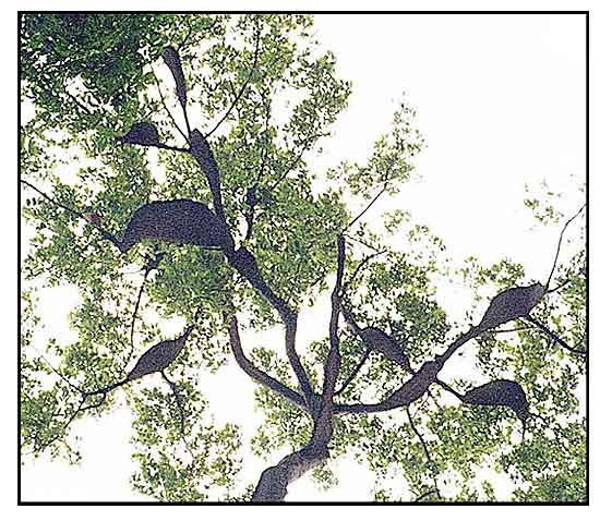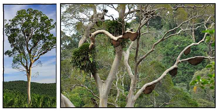 with slippery trunks that protect them from sun bears, making them attractive to giant honey bees Apis dorsata that hang their huge combs from the branches. (2)