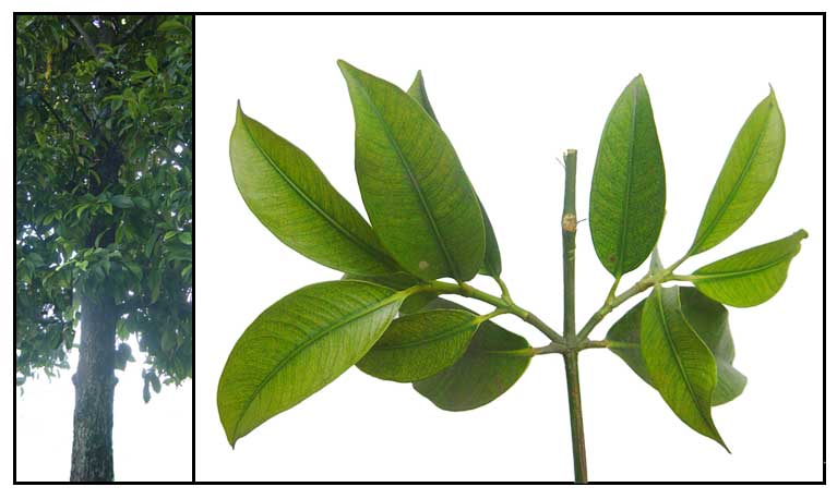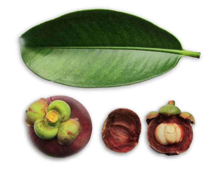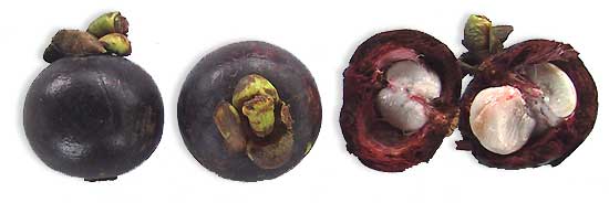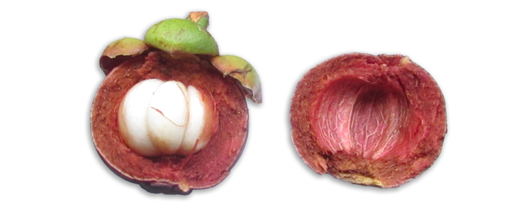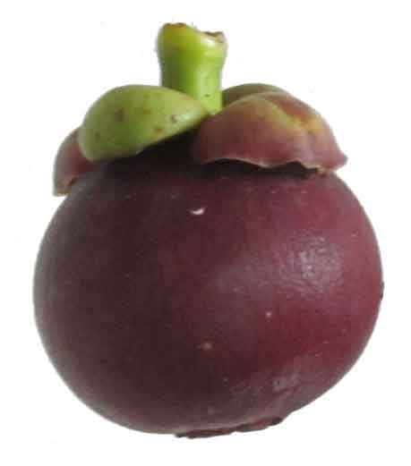 • The mangosteen is a small, evergreen tree, very slow-growing, erect with a pyramidal crown; attains 6-25 m in height, has dark-brown or nearly black, flaking bark, the inner bark containing yellow, gummy, bitter latex. Leaves opposite, short-stalked, ovate-oblong or elliptic, leathery and thick, dark-green, slightly glossy above, yellowish-green and dull beneath; 9-25 cm long, 4.5-10 cm wide, with conspicuous, pale midrib. New leaves rosy. Flowers 4-5 cm wide, fleshy, may be male or hermaphrodite on the same tree. The former are in clusters of 3-9 at the branch tips; there are 4 sepals and 4 ovate, thick, fleshy petals, green with red spots on the outside, yellowish-red inside. Stamens many, fertile and sterile. The hermaphrodite are borne singly or in pairs at the tips of young branchlets; their petals may be yellowish-green edged with red or mostly red, and are quickly shed. Fruit a subglobose berry, capped by the prominent calyx at the stem end, with 4-8 triangular, flat remnants of the stigma in a rosette at the apex, dark-purple to red-purple and smooth externally, 3.4-7.5 cm in diameter. The rind is 6-10 mm thick, red in cross-section, purplish-white on the inside; contains bitter yellow latex and a purple staining juice. There are 4- 8 triangular segments of snow-white, juicy, soft flesh (actually the arils of the seeds). The fruit may be seedless or have 1-5 fully developed seeds. Seed ovoidoblong, somewhat flattened, 2.5 cm long and 1.6 cm wide that cling to the flesh. Flesh slightly acid, mild to distinctly acid in flavor, acclaimed to be exquisitely luscious and delicious. (78)