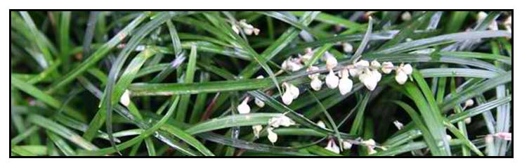 • Ophiopogon japonicus is an evergreen, sod-forming perennial plant; an underground species with large stolons with tuberous roots. Leaves are linear, 20–40 cm long. Flowers are white through pale lilac, borne in a short raceme on a 5- to 1-cm stem. Fruit is a blue berry, 5 mm in diameter. (48)