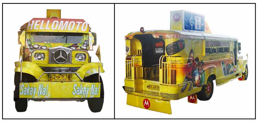 | Aging galvanized units are often contracted for advertising purposes. This jeepney was dressed up inside-out in an eye-catching yellow-and-red motif for a Motorola cell-phone campaign. The driver-owner is paid P2,500 a month for a three-month contract. For the owner, a great short-term monthly windfall while continuing to ply his usual daily routes. For passengers who are motorola user, a promo offer of a free ride. |