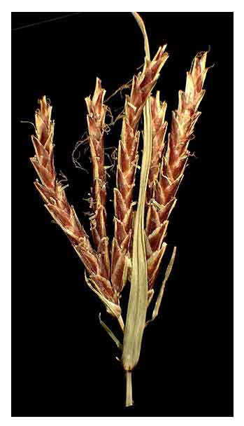 3-angled above. Leaves are 5 to 15 centimeters long, sometimes as long as the stems, about 3 millimeters wide, and narrowly linear. Umbel is simple or compound, 2 to 6 centimeters long, with 2 to 8 unequal primary rays. Spikes are dense or rather lax. Spikelets are 3 to 8, 10 to 25 millimeters long, brown, slender, with 10 to 25 florets in each spikelet, linear, and slightly compressed. Rachilla of the spikelet