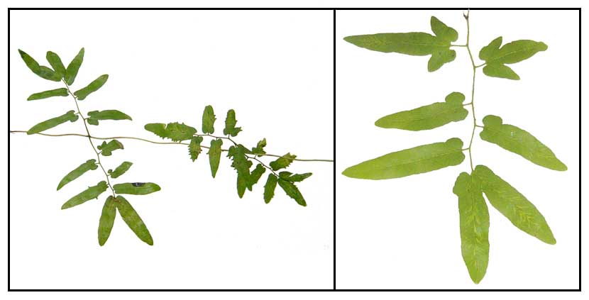 • Growth form: A terrestrial climbing fern with digitate fronds growing to several meters tall. Foliage: Fronds are held on a long stipe, to 50 cm or more, narrowly winged on the upper part. The main rachis-branch is very short, up to 3 mm long covered in downy hairs. The secondary rachis-branch is pinnate to bipinnate, each leaflet is trilobed to arrow-shaped or simple with each lobe up to 15 cm long, 2.5 cm wide with toothed margins held on a winged, sparsely hairy stalk up to 1 cm long. The stalk may thicken at the attachment point of the blade. Reproductive parts-Non-flowering: Spore-bearing lobes protrudes at the margin of the lobes, up to 10 mm long, 1.5 mm wide. Others: Rhizomes are short-creeping, covered in dark brown to black hairs. (23)