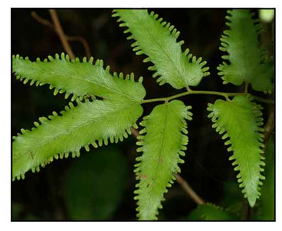 • Growth form: A terrestrial climbing fern with digitate fronds growing to several meters tall. Foliage: Fronds are held on a long stipe, to 50 cm or more, narrowly winged on the upper part. The main rachis-branch is very short, up to 3 mm long covered in downy hairs. The secondary rachis-branch is pinnate to bipinnate, each leaflet is trilobed to arrow-shaped or simple with each lobe up to 15 cm long, 2.5 cm wide with toothed margins held on a winged, sparsely hairy stalk up to 1 cm long. The stalk may thicken at the attachment point of the blade. Reproductive parts-Non-flowering: Spore-bearing lobes protrudes at the margin of the lobes, up to 10 mm long, 1.5 mm wide. Others: Rhizomes are short-creeping, covered in dark brown to black hairs. (23)