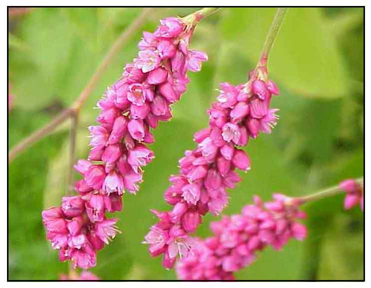 • Polygonum orientale is a branching annual, 30 to 100 centimeters in height. Leaves are long petioled, ovate or ovate-cordate, 15 to 20 centimeters long, 5 to 12 centimeters wide, and covered with soft, silky, gray hairs. Racemes are cylindric, laxly panicled, 8 to 13 centimeters long. Flowers are white. Nut is rounded, black and shining, about 3 millimeters in diameter.