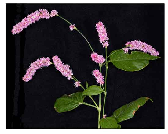 • Habit: Annual, rhizomes, stolons 0. Stem: erect, 50--200(250) cm, +- glabrous to hairy, +- ribbed. Leaf: ocrea funnel-shaped, 10--20(25) mm, brown, papery at base, leaf-like distally, margins truncate, ciliate, bristles 1--3 mm, surface strigose, not gland-dotted; petiole 1--9(14) cm; blade 4--25(30) cm, 2--16 cm wide, ovate, scabrous on midveins, strigose to densely hairy especially along veins, not +- gland-dotted, not dark blotched adaxially, base wedge-shaped, tip acute to acuminate. Inflorescence: axillary, terminal, spike-like, nodding or erect, not interrupted, 20--180 mm, 5--20 mm wide; flowers 1--5; peduncle (0)10--50 mm, glabrous, gland-dotted; bractlets not overlapped; pedicels ascending to spreading, 1--5 mm. Flower: perianth +- bell-shaped, 3--4.5 mm, pink to dark pink, not gland-dotted, lobes 5, obovate, margins of same color, veins +- prominent or not, not anchor-shaped, tips obtuse to rounded; stamens 6--8, included or exserted, anthers pink or red; styles 2, fused basally. Fruit: 2--3.5 mm, 1.5--3 mm wide, lens-shaped, dark brown to black, shiny to dull, minutely rough. (29)