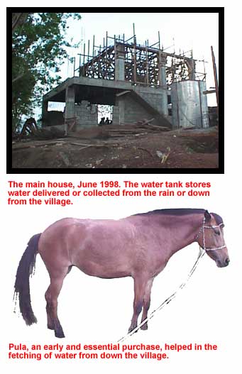 From late May to early October, rains become predictable making the roads up to the peak unpassable for vehicular delivery. A horse was purchased for the purpose of water-hauling, but his contribution to resolving the water needs was minimal. Drain spouts were contrived to collect rain water. On occasions of downpours that caused accumulation of rain puddles, even in the midnight hours, Ruben could be heard shoveling or scoopiing the rain water onto collection drums. Still, there were stretches of days when lack of water - or too much of it on the ground - caused work stoppages.