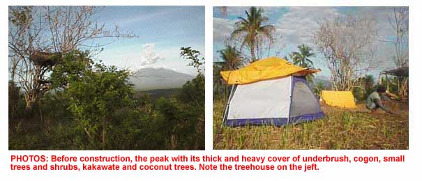 | It was a vision that took form so slowly, at first, uncertain, poorly defined, but persistent, fueled by recurrent late nights tippling and libating on 95-proof lambanog. It had small and meager imaginings, a one-room school house with a small library, to be built at the peak of 50-some hectares of the family's farm. The peak. . .yes, it was that "peak" that started it. A kilometer walk of winding paths through 52 hilly hectares with sprawl areas of coconut, banana trees, and seasonal cash-crops, a mango plantation, interspersed with the wild growth of fruit-bearing trees and countless variety of flora . The hike finishes with an acute slope that can be brutal for the unaccustomed heart, but rewarded by the magnificent view from the peak. |