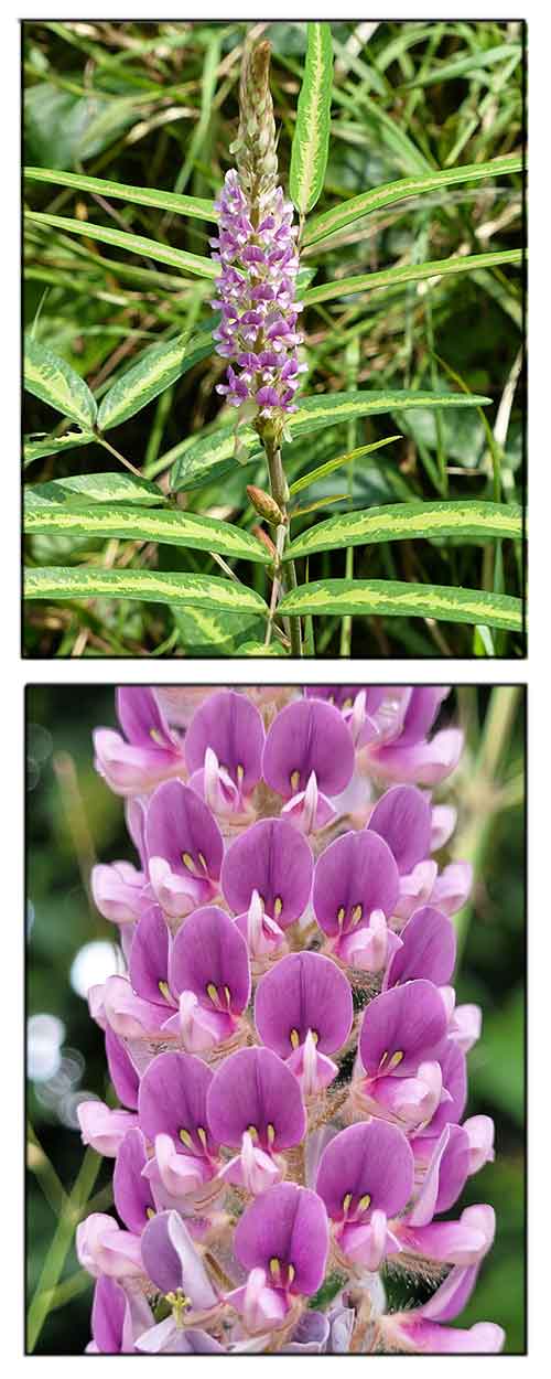 • Painted Uraria is an erect perennial, undershrub, 1-6 ft tall, branches velvety. Lower leaves are 1-3-foliolate, upper 5-9-foliolate. Leaflets of the lower leaf 2-8 cm long, 2-3 cm broad, ovate; of upper leaves, 7-25 cm long, 5-25 mm broad, ovate-lanceolate, pointed, often variegated, stalk 3.5-6.5 cm long. Inflorescence is 10-70 cm long, carried on a 0-5 cm long stalk. Bracts are 1.4-2.5 cm long, long pointed, completely covering the bud, deciduous. Flowers stalks are 6-9 mm long. Sepals are 4-5 mm long. Flowers are purple, pink or bluish, 8-9 mm long. Fruit is 5-9 mm long, with 3-6 segments, each 2-3 mm broad, smooth, polished, folded on one another. (FlowersOfIndia)