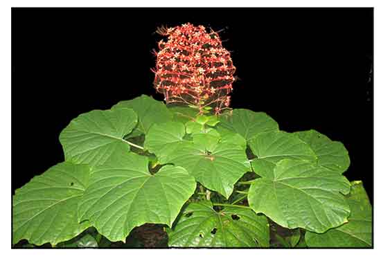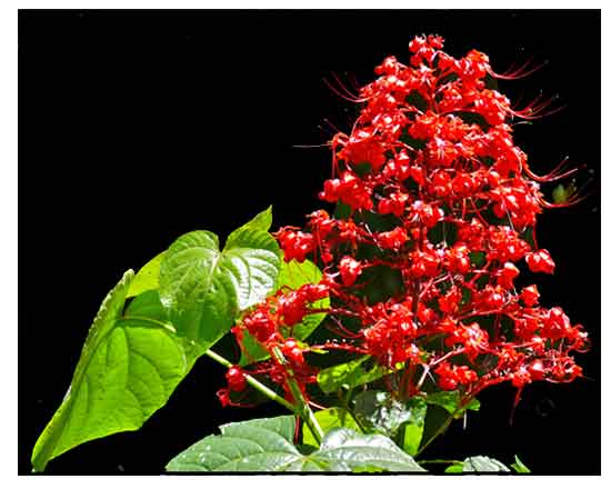 • C. paniculatum is an erect, semi-woody shrub reaching a height of 1-2m(Figure 1). Leaves are simple, large, opposite, up to 30cm in diameter. Leaves are membranous, cordate-ovate, 3-7 lobed (lobes shallow), margins minutely denticulate, glandular beneath and petiole is up to 30cm long with acuminate apex. Flowers are in large terminal panicles. Calyx is red to orange-red in color and divided nearly to the base. Corolla are orange-red to scarlet with slender tube which is up to 2 cm long and the lobes are approximately 7mm long. Flowering occurs more or less throughout year. Fruit is a drupe, globose, bluish-black in color and approximately 1cm across. (6)