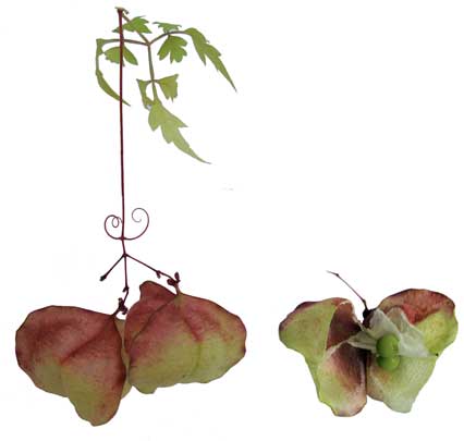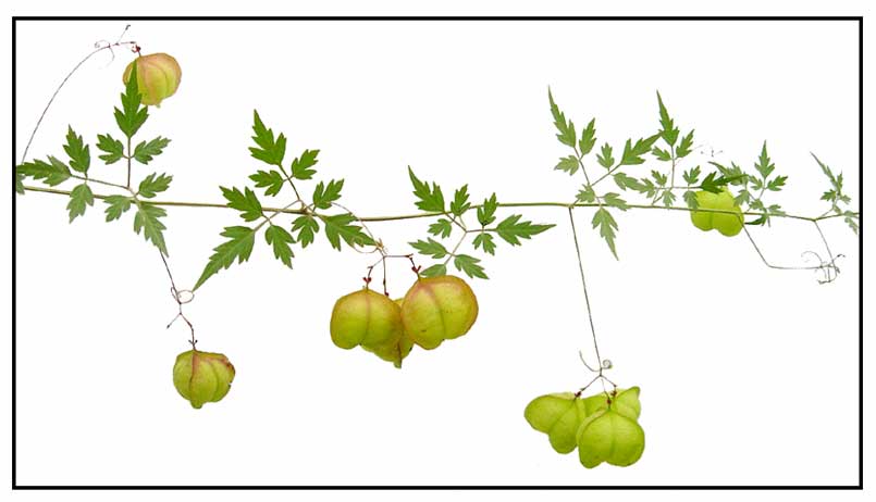 • A herbaceous vine. Leaves are bi-ternate. Leaflets are ovate-lanceolate, having glabrous texture, smooth surface and dentate margins. Length of the leaf is 3-5 cm and breadth 1.5-2 cm. Stems having width 0.2-0.3 cm and green in color. Petiole is 1.5-2.5 cm. Leaf has a bitter taste and characteristic leafy odor. Flowers tetramerous irregular, 2 + 2 sepals, 2 + 2 unequal petals. Stamens-8, unequal. Ovary is tricarpellary with one ovule in each carpel. Stigma is trifid. Fruits are globose, winged bloated capsule.