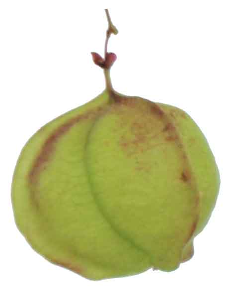 at the base. Ovary is 3-celled, style 3-fid, ovules solitary. Fruits are inflated, obovoid, 1.5 to 2.5 centimeters long, somewhat triangular
