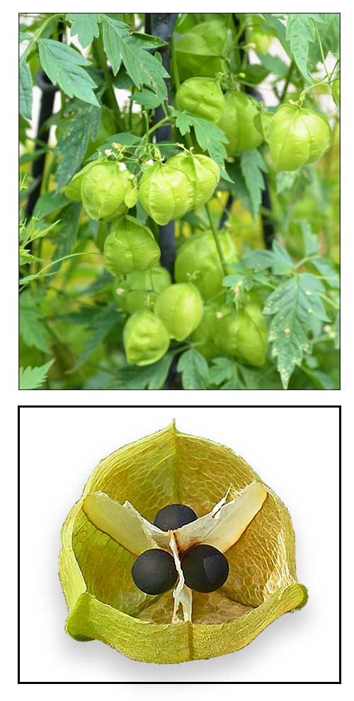 - Etymology: The Genus name Cardiospermum derives from Greek words, meaning "heart" and "seeds", referring to its large, black seeds, the white mark of which is reminiscent of a stylized heart. The species epithet helicacabum is Greek for 'salt barrel', referring to the inflated fruits and the 'balloon vine' name. (62)