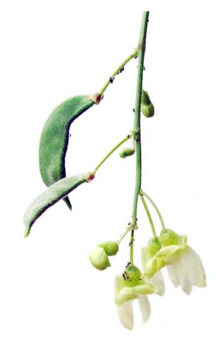 Pods are oblong and slightly curved, 6 to 12 centimeters long, about 2 centimeters wide,