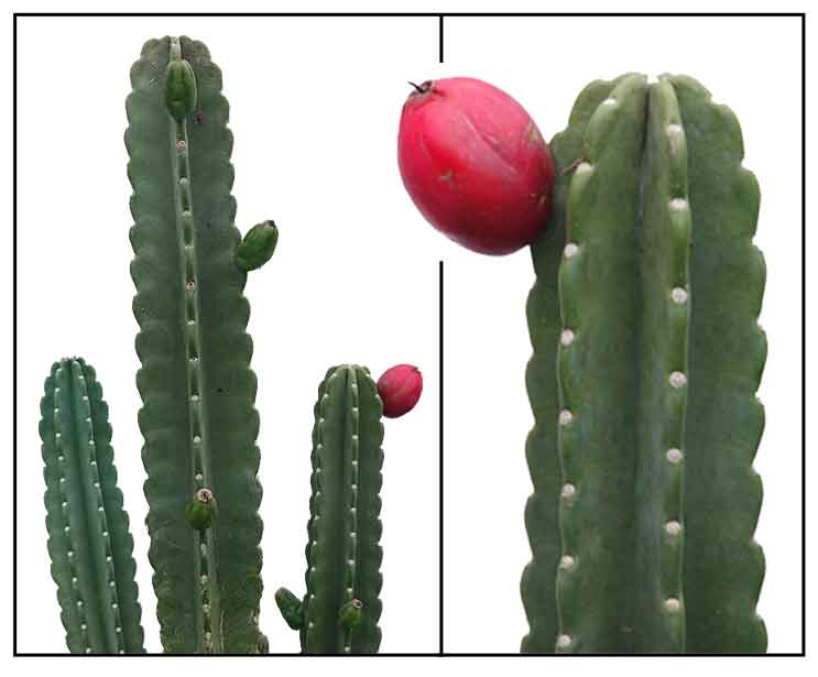 • Cereus repandus is a large shrubby or tree-like cactus with many columnar stems, reaching a height of 10 m. usually much branched from the base. With scaffolding support, it can grow to a height of 34 m. Stems are gray-green to blue-green, cylindrical with 8-13 ribs, sometimes segmented, and up to 20 cm in diameter. Thorns are variable, numerous, gray, and needle-like, but occasionally missing. Longest thorn up to 5 cm long. Flowers are large, white or cream-colored with reddish tips, up to 15 cm in diameter, borne on an elongated tube, somewhat fragrant, tube short and often ridged, stigma exerted before flower open, and nocturnal, which only open for one night. Fruits are without thorns, spherical or egg-shaped, up to 4 cm long, varying in color from dark red, purple, or yellow, containing small, edible, crunchy seeds, the flesh sweetens as it ripens.