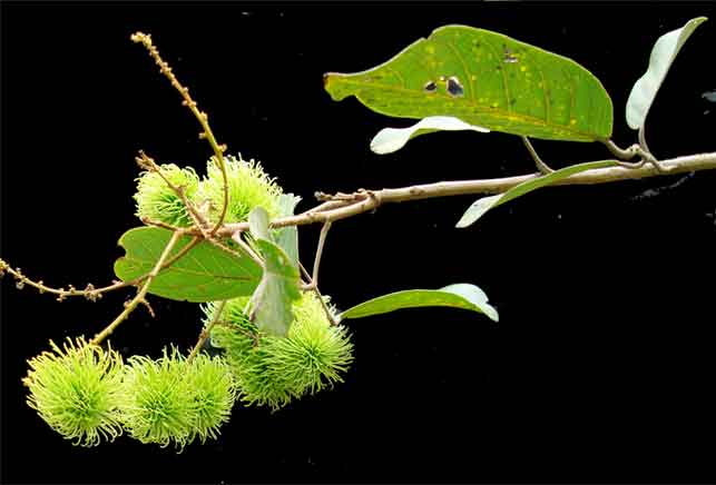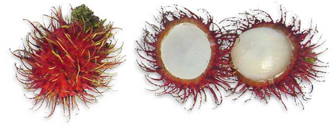 • Nephelium lappaceum is an evergreen tree growing to a height of 15–24 meters (49–79 ft). Leaves are alternate, 14–30 cm long, pinnate, with three to 11 leaflets, each leaflet 5–15 cm wide and 3–10 cm broad, with an entire margin. Flowers are small, 2.5–5 mm, apetalous, discoidal, and borne in erect terminal panicles 15–30 cm wide. Trees can be male (producing only staminate flowers and, hence, produce no fruit), female (producing flowers that are only functionally female), or hermaphroditic (producing flowers that are female with a small percentage of male flowers). Fruit is a round to oval single-seeded drupe, 3–6 cm (rarely to 8 cm) long and 3–4 cm broad, borne in a loose pendant cluster of 10–20 together. Skin is leathery, reddish (rarely orange or yellow) and covered with fleshy pliable spines, hence the name, which means 'hairs'. Spines (also known as "spinterns") contribute to the transpiration of the fruit, which can affect the fruit's quality. Fruit flesh, the aril, is translucent, whitish, or very pale pink, with a sweet, mildly acidic flavor reminiscent of grapes. Single seed is glossy brown, 1–1.3 cm, with a white basal scar. (53)