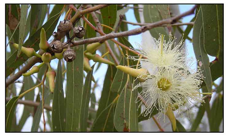 • Antiradical / Antioxidant / Antimicrobial / Essential Oil: Study evaluated the therapeutic potential of E. tereticornis essential oil. Essential oil yield by steam distillation was 0.75%. Thirty-three compounds were identified, representing 99.09% of the oil. Major constituents were α-pinene (55.72%), ß-pinene (16.73%), O-cymene (7.40%), eucalyptol (5.45%), ß-terpineol acetate (2.69%), and aroma-
