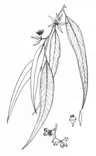• Eucalyptus tereticornis is a tree reaching a height of 15 meters or more in the Philippines. Trunk is usually straight and at least half the total height. Crown is large and somewhat open. Bark is grayish and peels off in thin layers. Leaves are leathery, lanceolate, somewhat sickle-shaped, and 10 to 25 centimeters i length. Peduncles are axillary or lateral and up to 1.5 centimeters long, each bearing 3 to 5 short-peduncled flowers. Flowers are white, about 1.5 centimeters in diameter, in small clusters. Fruit is obovoid or somewhat rounded, about 8 millimeters in diameter.