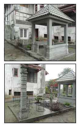 When the American came to liberate the town, the house was strafed. The bombing totally destroyed the middle part of the stone house. Further damage was added by torching done by the Makapilis. What remained of the original Mapua structure was the Elias and Crocodile garden sculpture, the two-story veranda in front, and the four-story portion in the rear. The intact front and rear portions were connected by temporary shelters--barong-barongs made of bamboo, roofed by salvaged GI sheets.