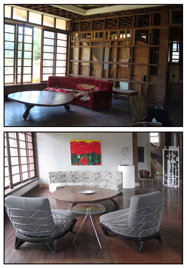 The resurrection of the toxic couch, fabricating the two wire-backed chairs (copied from a P33K chair purchased on sale for P22K, built on site for less than P10K each), and bringing back the big round dao table from Pulang Lupa. The artworks are mine, the painting and altar wall construction "borrowed" from Pulang Lupa, and the two sculptures done on site, metalworks done on idle days with Danny.