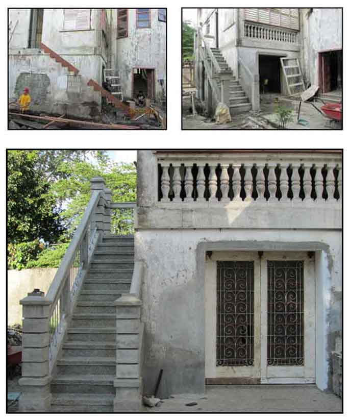 The staircase is an addition. It replaced what was once a dirty kitchen and rickety wooden staircase that ended into a few concrete steps curving inward at the bottom. The design uses elements from the old house design -- the fence grill work and posts and the grooved cement works. The room to the right used to be the katiwala's and servers' room for sundry kitchen preparation needs. The sliding door was recycled from two balcony/bedroom doors. |