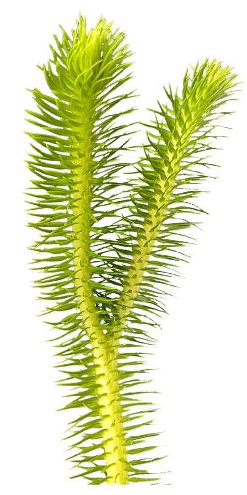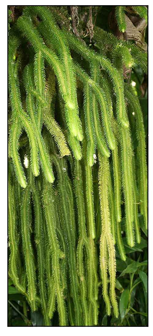 • Growth form: A type of fir clubmoss, one of the oldest "living fossils" of fern-allies, with fossils dating back to the Carboniferous period (~360 million years ago). Herbaceous with creeping rhizomes, arching to 20cm height and trailing up to 75cm length. Foliage: Fronds trailing, tufted, arched or nodding towards tip, bifurcating (dividing into 2) as they lengthen. Stems thin (4mm across), brownish when older. Frondlets pale to yellowish green, narrowly-linear and bristle-like, whorled at 60-90° along stem axis. Bulblets (gemmae) formed at base of upper fronds during end of each annual growth cycle. (3)