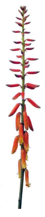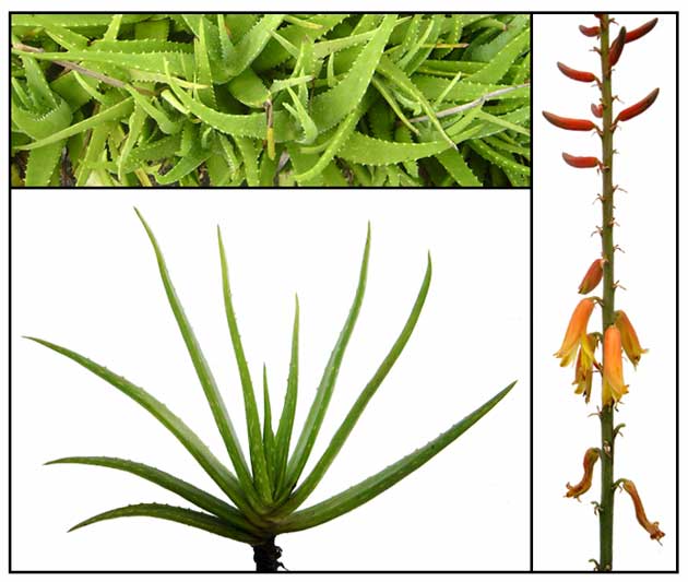 • Aloe vera is a stemless or very short-stemmed plant growing to 60–100 centimeters (24–39 inches) tall, spreading by offsets. Leaves are thick and fleshy, green to grey-green, with some varieties showing white flecks on their upper and lower stem surfaces, the margins serrated with small white teeth. Flowers are produced in summer on a spike up to 90 cm (35 in) tall, each flower being pendulous, with a yellow tubular corolla 2–3 cm (3⁄4–1+1⁄4 in) long. Like other Aloe species, Aloe vera forms arbuscular mycorrhiza, a root symbiosis that allows the plant better access to mineral nutrients from the soil. (83)