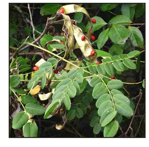 (- 11) pairs of leaflets. Leaflet is pale green, thin, elliptic to ovate shaped (1.5 – 4.5 cm long and 1 – 2.2 cm wide). It has rounded to truncate tip and unequal base. The upper surface of the leaflet is smooth while the underside is covered with appressed fine hairs. Flowers occur in a cluster (Raceme). The raceme is 12 – 30 cm long and flowers open from the base to the tip of the inflorescence. Flowers are white to yellow and turning dark yellow after anthesis. Flowers are small (0.3 – 0.5 cm) and strongly fragrant. Fruit pod is woody, curved and about 25 cm long and 1.3 – 1.8 cm wide. The pod is green and almost straight when young. As it matures, the pod turns brown, twists spirally and splits open to reveal the seeds within. Each fruit contains up to 25 seeds. They are bright scarlet red, shiny, hard and lens-shaped (0.7 – 0.9 cm long, 0.7 – 0.95 cm wide, 0.65 cm thick), with faint “heart line” (pleurogram) around the margin.