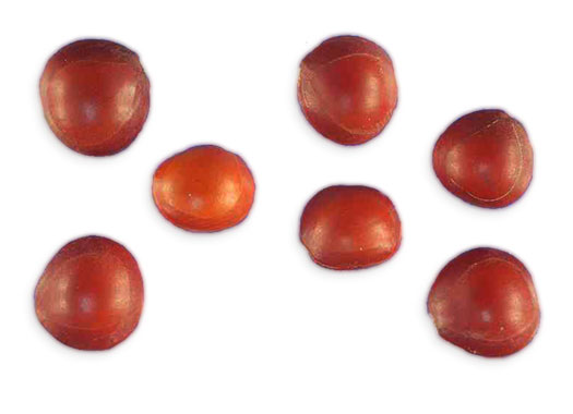 - Seeds look similar to the red-black and very toxic seeds of Abrus precatorius (Rosary pea / Prayer beads / Saga).