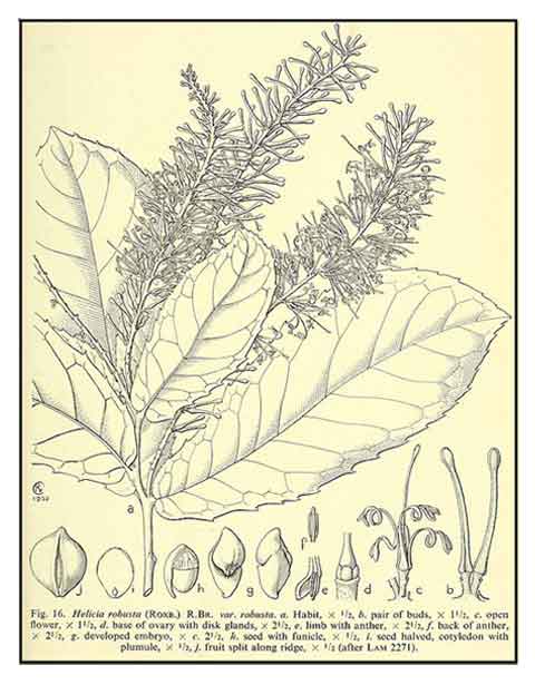 | OTHER IMAGE SOURCE: Illustration / Helicica robust [502922 ] / Flora Melesiana : Vol 5 (1955-1958) / contributed by New York Botanical Garden , USA / PlantIllustrations.org |