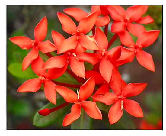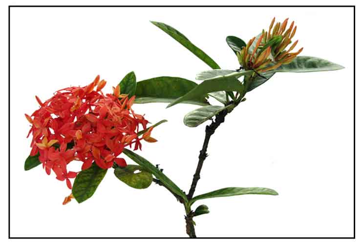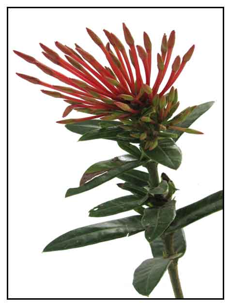 • Ixora coccinea is a branched shrub, up to 1 m tall; branches hairless. Leaves are mostly stalkless, opposite deccussate, 4-8 x 1.5-6.5 cm, entire, apiculate, blunt or with a short sharp point, 8-15 pairs at lateral nerves, hairless; stipules triangular, cuspidate or awned. Flowers are borne at branch-ends, in dense corymb-like cymes, flower-cluster-stalk very short or absent; bracts about 8 mm long. Flowers are stalkless, bright scarlet, hypanthium 1-1.5 mm long, becoming hairless, teeth, about 0.5 mm long. Flower-tube is prominently long, 2.5-4.0 cm long, 1.5 mm wide, hairless, petals 8-10 x 4-5 mm, twisted in bud, throat hairless. Stamens are 4, inserted on the throat of flower-tube, filaments very short. Style protruding; stigma 1.5 mm long. Fruit is spherical, red when ripe, crowned with the sepal-cup teeth. (66)