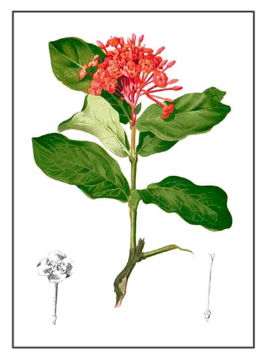 • Antidiarrheal / Flowers: Study evaluated the antidiarrheal effect of an aqueous extract of I. coccinea in experimental models of diarrhea in albino Wistar rats. The plant extract showed significant (p<0.001) inhibitory activity against castor oil induced diarrhea and castor oil induced enteropooling in rats. There was significant reduction in gastrointestinal motility in the charcoal meal test. (16)