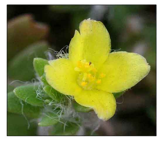 Sayikan is a slender, prostrate, annual, succulent herb, the stems rooting at the nodes from each of which grows a ring of hairs. Leaves are very shortly toothed, ovate-elliptic, and about 5 millimeters long. Flowers are small, terminal, and solitary, surrounded by a 4-leaved involucre and copious white hairs. Petals are four and yellow. Capsule dehisces horizontally, and contains minutely tubercled seeds.