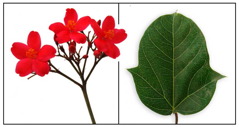 • Jatropha integerrima is a medium-sized branching shrub, growing up to 3 meters high. Leaves are ovate to oblong, up to 10 centimeters long and 7 centimeters wide, fiddle-shaped or with 3 sharply pointed lobes. Blade is dark green above and light green below, with petioles up to 5 centimeters long, with entire margins. Flowers are red, showy, emerging as clusters on terminal cymes and borne by a peduncle up to 12 centimeters long. Fruit is an oval 60loobed capsule containing 3 smooth and spotted seeds.