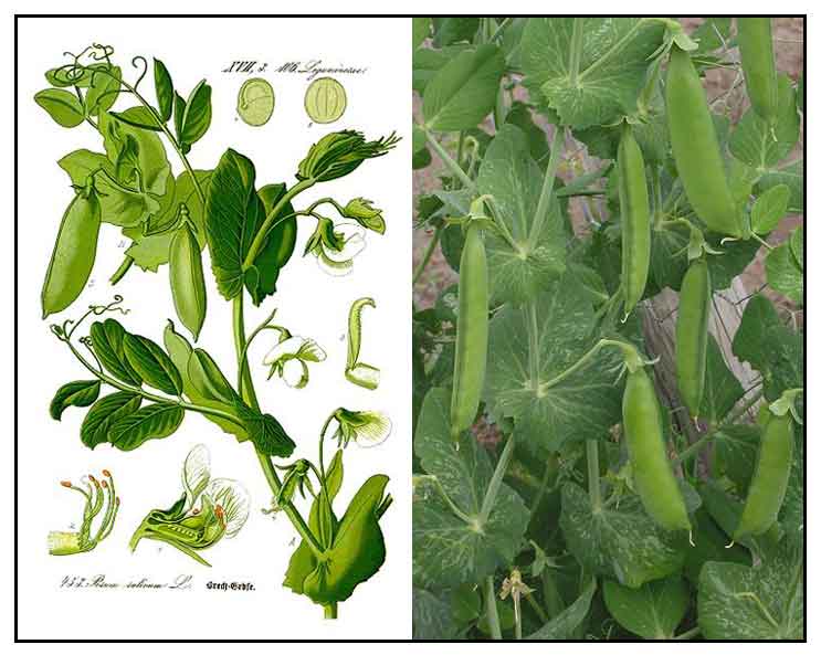 Peas have hypogeal germination: the cotyledons remain enclosed within the seed coat beneath the soil surface. Flowers are white, developing into inflated pods.