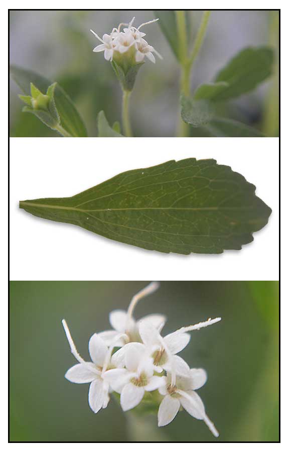 10 1 meter high. Stems are soft. Leaves are oval shape, 2 to 3 centimeters long. Flowers are small and white, with a pale purple throat. Tiny white florets are in small corymbs of 2-6 florets, arranged in loose panicles.