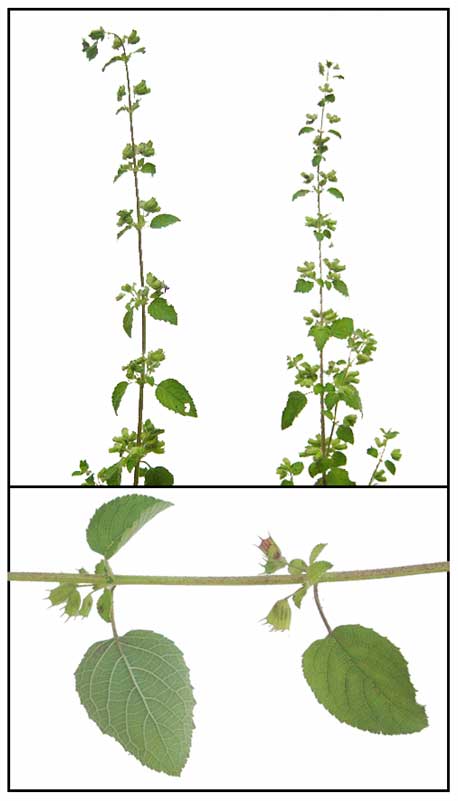 Suob kabayo is a coarse, erect, branched, more or less hairy, aromatic annual, 0.5 to 2 meters tall. Stems are square. Leaves are ovate, opposite, 4 to 9 centimeters long, pointed at the tip, pointed to somewhat heart-shaped at the base, and toothed at the margins.