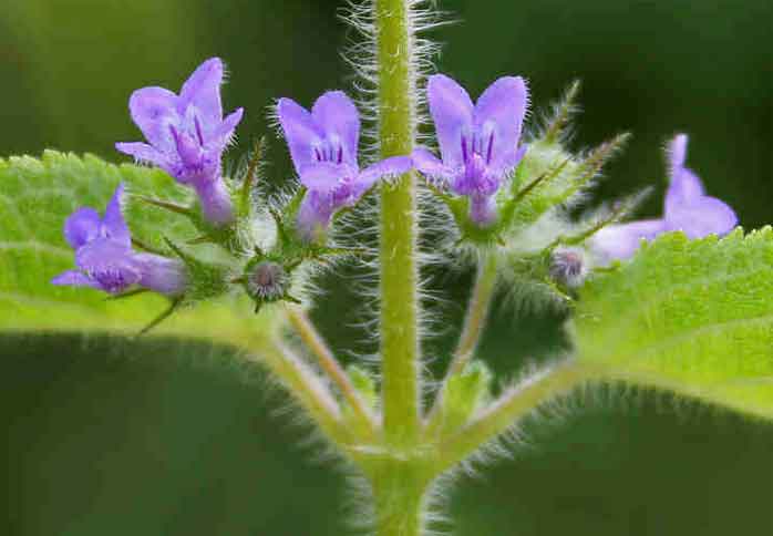 Flowers are long-stalked, occurring at the axils of leaves. Calyx in flower is hairy, about 4 millimeters long, but soon enlarges in fruit to about 1 centimeter long, striate with erect, stiff teeth. Corolla blue, strongly zygomorphic, bilabiate; stamens are 4, declinate, and about 8 millimeters long, with a limb 5 millimeters in diameter. Fruits have flat and mucilaginous seeds.